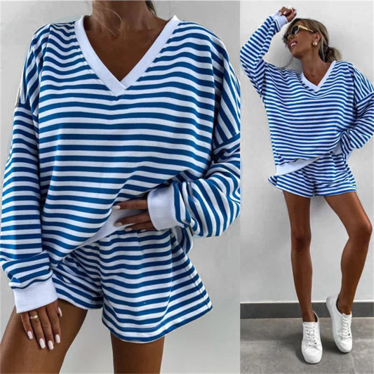 Dwuczęściowy strój damski Luźny top i szorty w paski z dekoltem w szpic