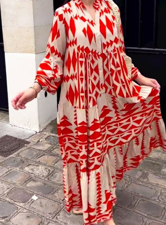 🔥Sukienka midi z dekoltem w kształcie litery V, frędzlami i rękawami z nadrukiem