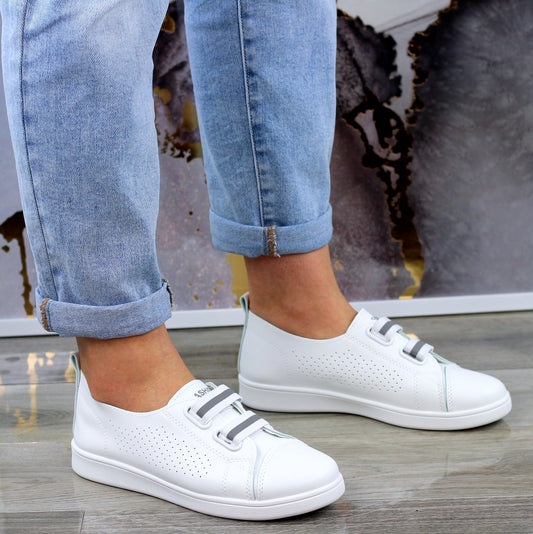 MODNE BIAŁO SKÓRZANE TRAMPKI DAMSKIE DZIURKOWANE FASHIONS