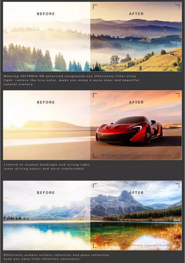 【 DZIAŁA DOBRZE, W DZIEŃ I W NOCY】. Nasze okulary przeciwsłoneczne z polaryzacją New Design są wykonane ze specjalnych fotochromowych soczewek polaryzacyjnych. Podczas jazdy w nocy lub w ciemnym otoczeniu soczewki są doskonale przezroczyste i poprawiają widoczność, jednocześnie skutecznie redukując odblaski. W ciągu dnia mogą skutecznie filtrować jasne światło, poprawiać ostrość widzenia, zmniejszać zmęczenie oczu i zawsze utrzymywać oczy w komfortowym stanie podczas aktywności na świeżym powietrzu.