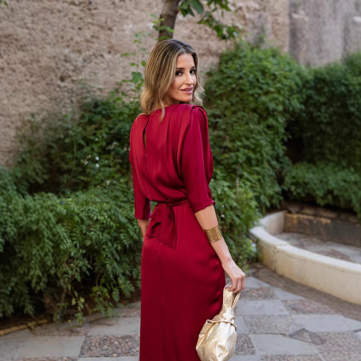 Satynowa sukienka midi z okrągłym dekoltem i krótkim rękawem w jednolitym kolorze