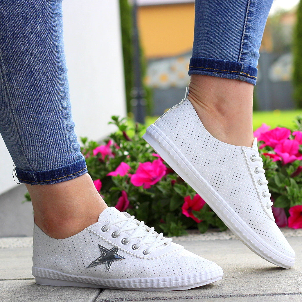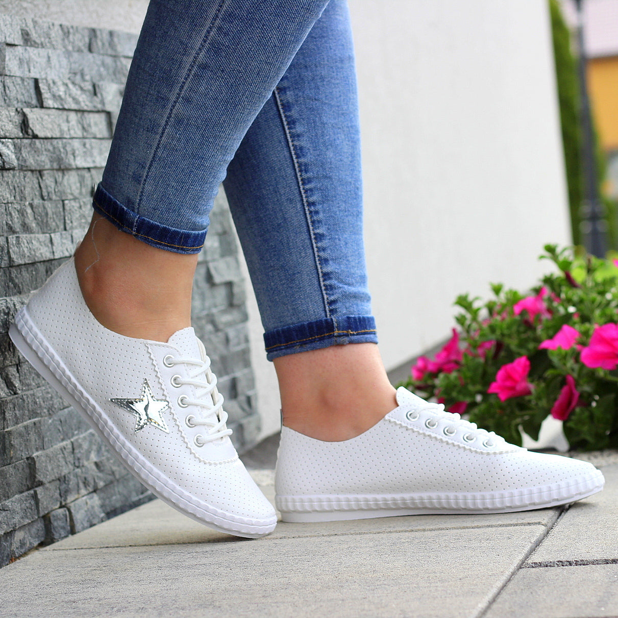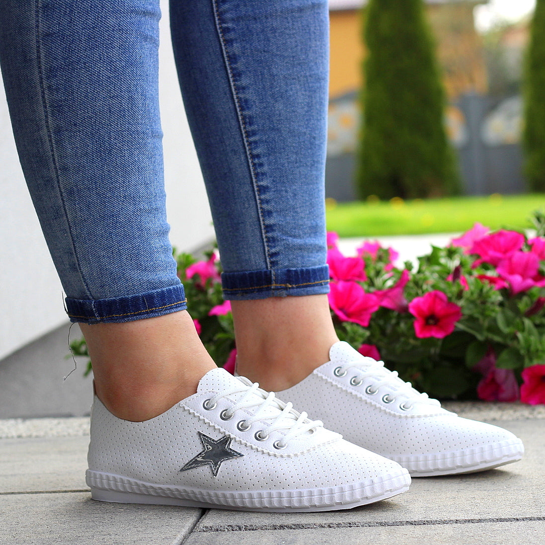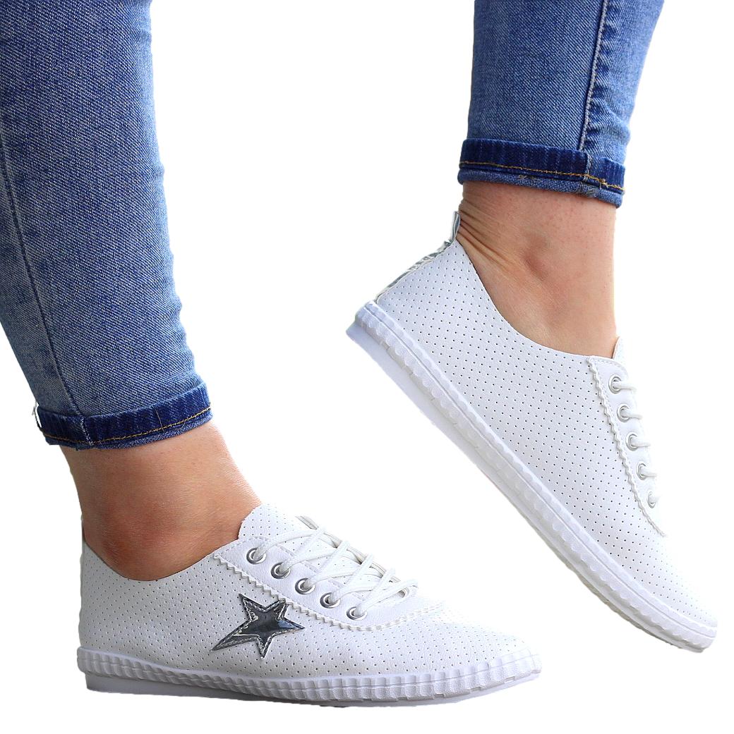 Białe trampki mięciutkie sznurowane slim na wygodnej podeszwie ze srebrną gwiazdą .
