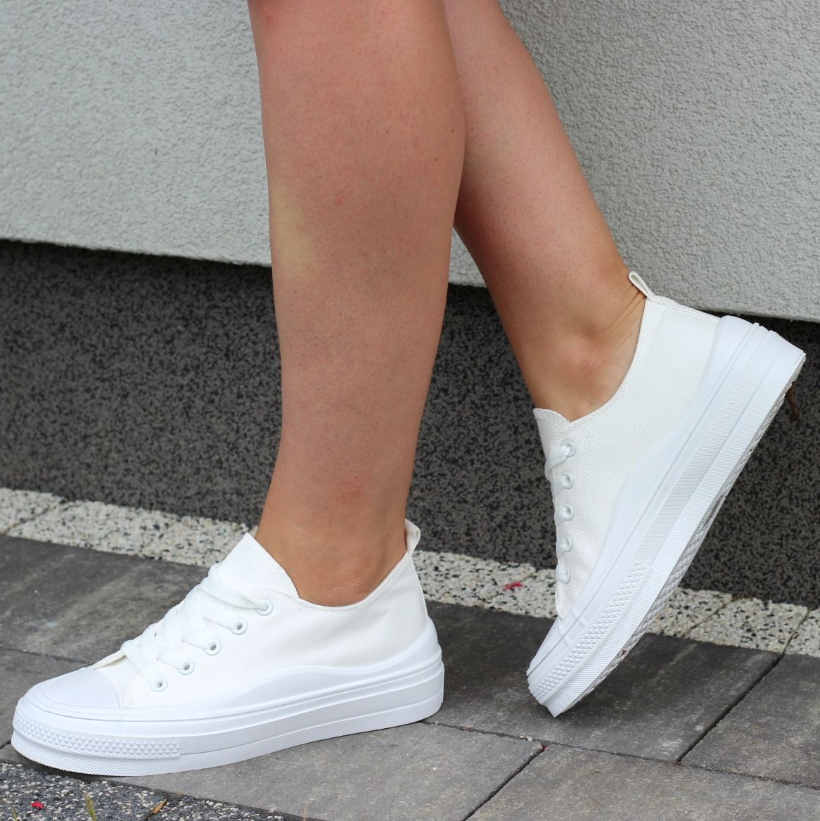 BIAŁE MATERIAŁOWE TRAMPKI DAMSKIE NA GRUBEJ PODESZWIE