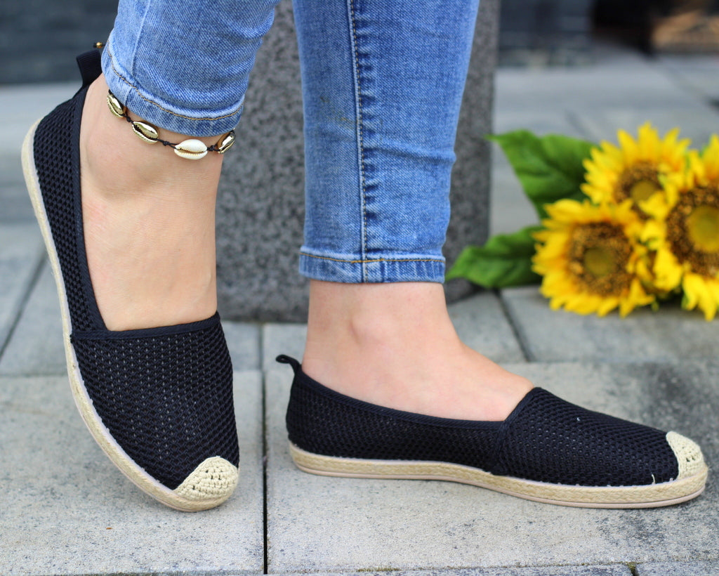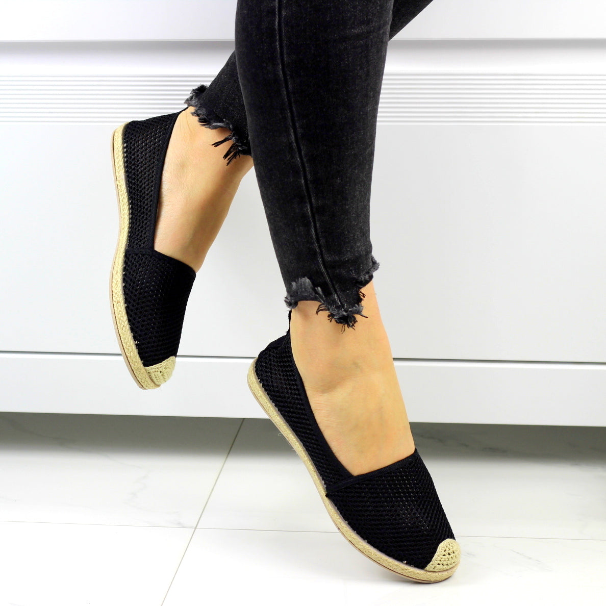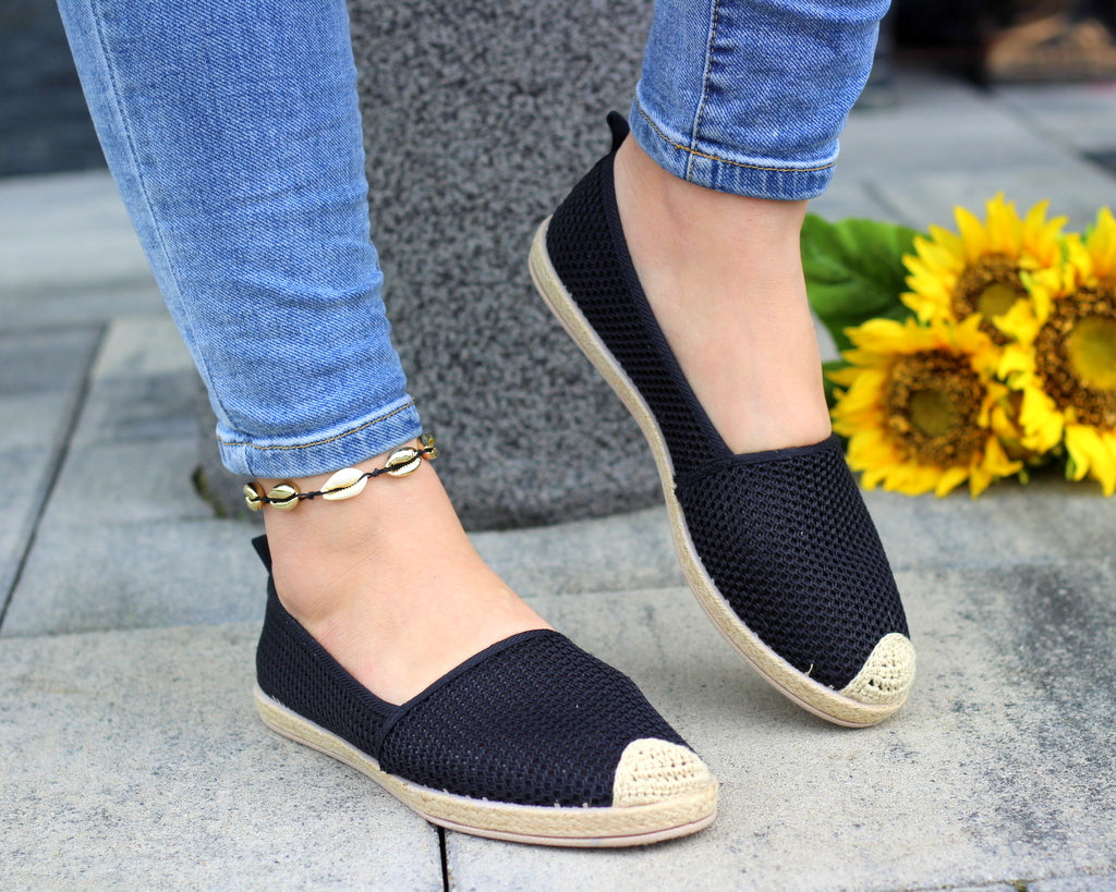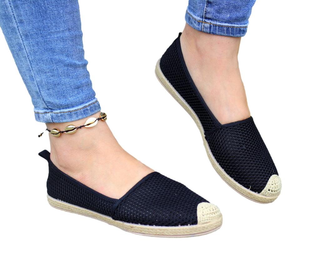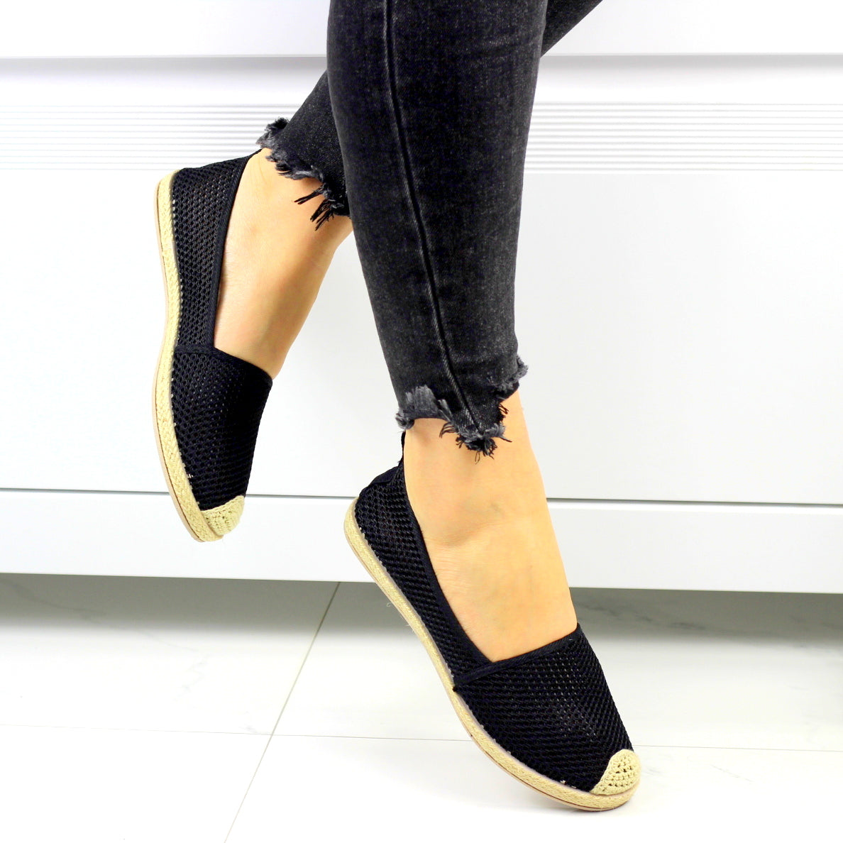 Czarne płaskie espadryle damskie ażurowy wzór koronka