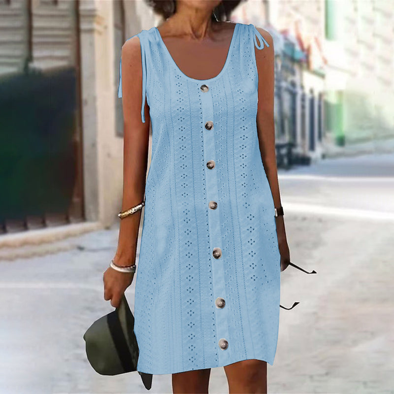 Ożyw swoją garderobę naszą dzianinową sukienką bez rękawów z dekoltem w kształcie litery U, wszechstronnym elementem, który łączy beztroski urok z nowoczesnym wdziękiem.