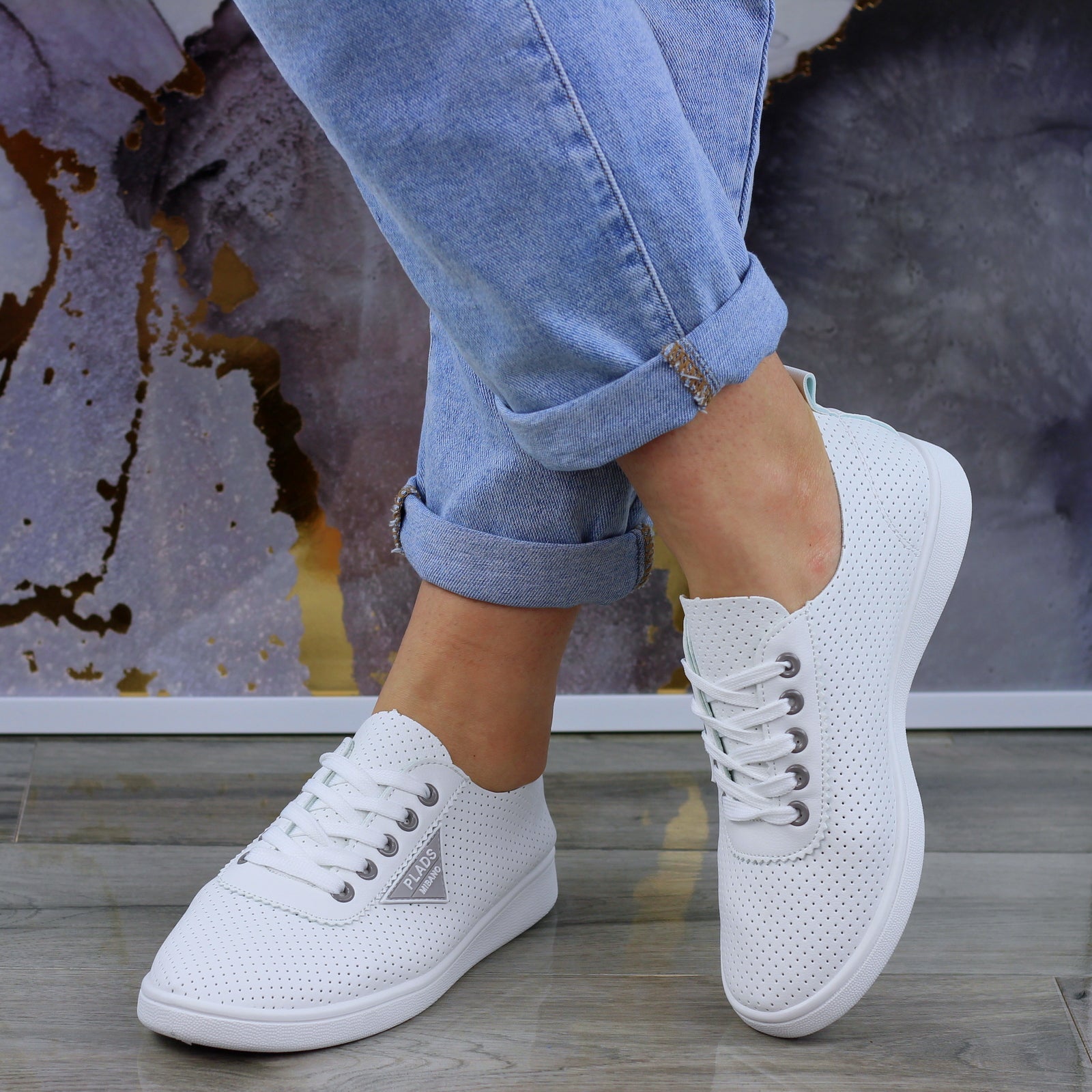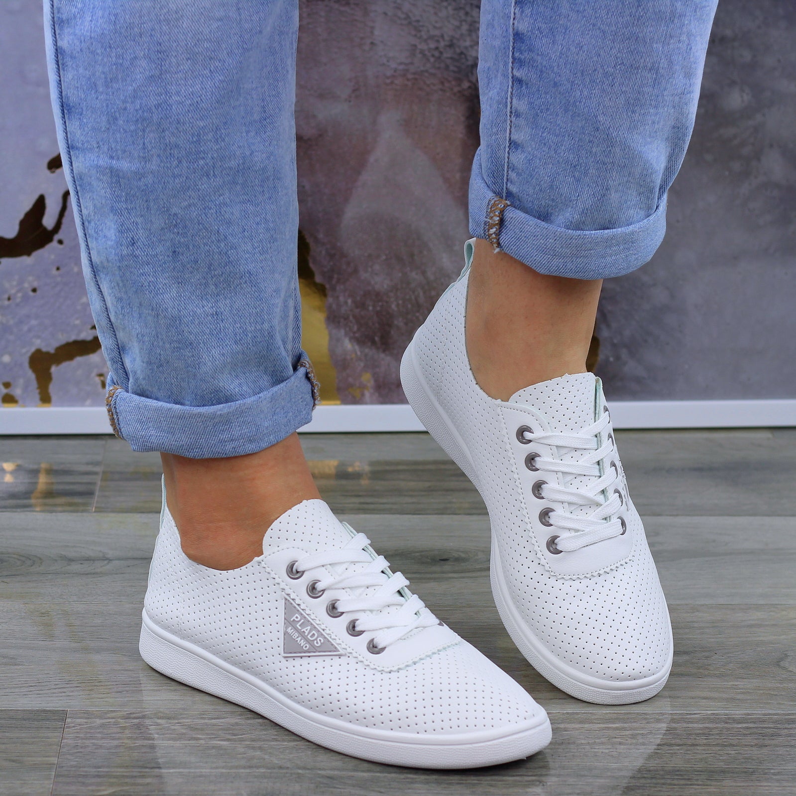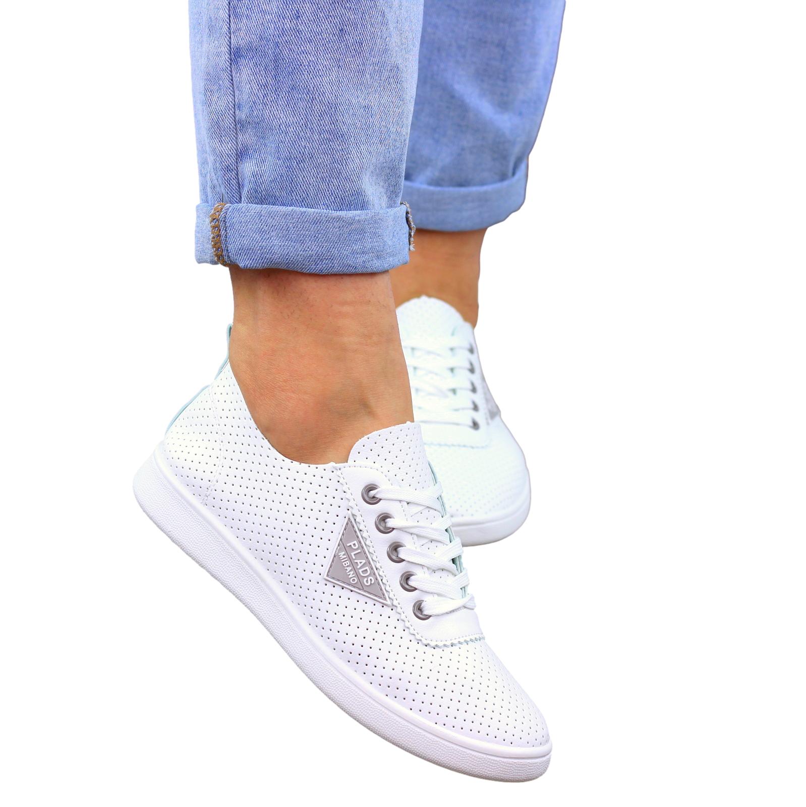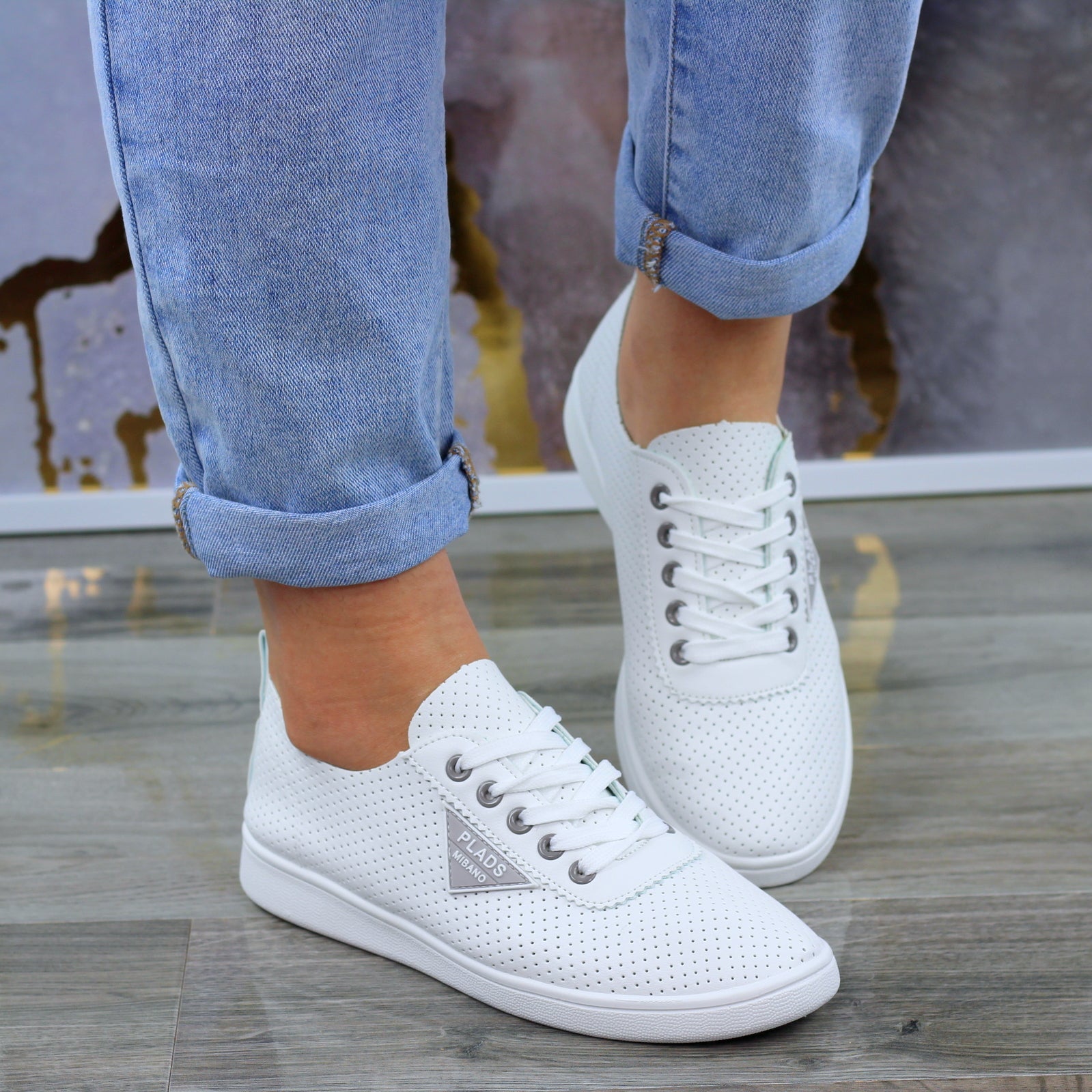 MODNE BIAŁO SZARE SKÓRZANE TRAMPKI DAMSKIE DZIURKOWANE Guss