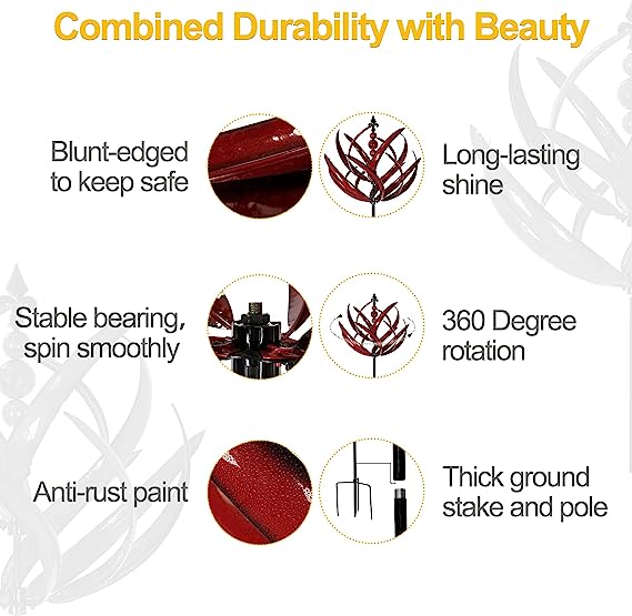 • Łatwy w montażu -  Nasz przydomowy wiatrak ogrodowy nie wymaga żadnych wtyczek ani przewodów, jest łatwy w montażu zgodnie z instrukcją. Może być wystawiony przy drzwiach wejściowych lub w ogrodzie za domem. Bardzo duży rozmiar, łatwo przyciągnąć uwagę innych.